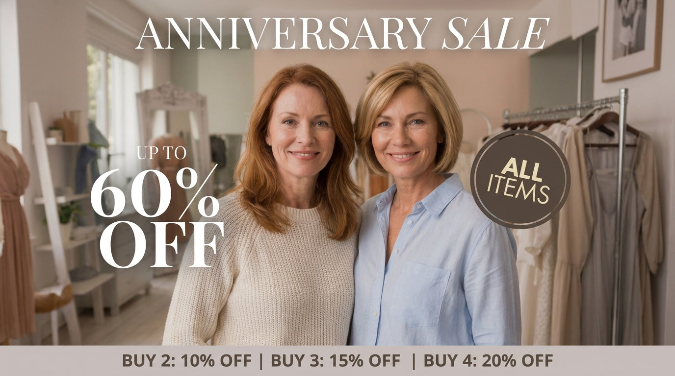 Now, weβre celebrating our anniversary with a special event: up to 60% off across all collections. Over the years, so many wonderful women have found their favorite pieces with us β dresses that made them feel beautiful, shoes that supported them every step of the way, and timeless styles that became part of their everyday life π€